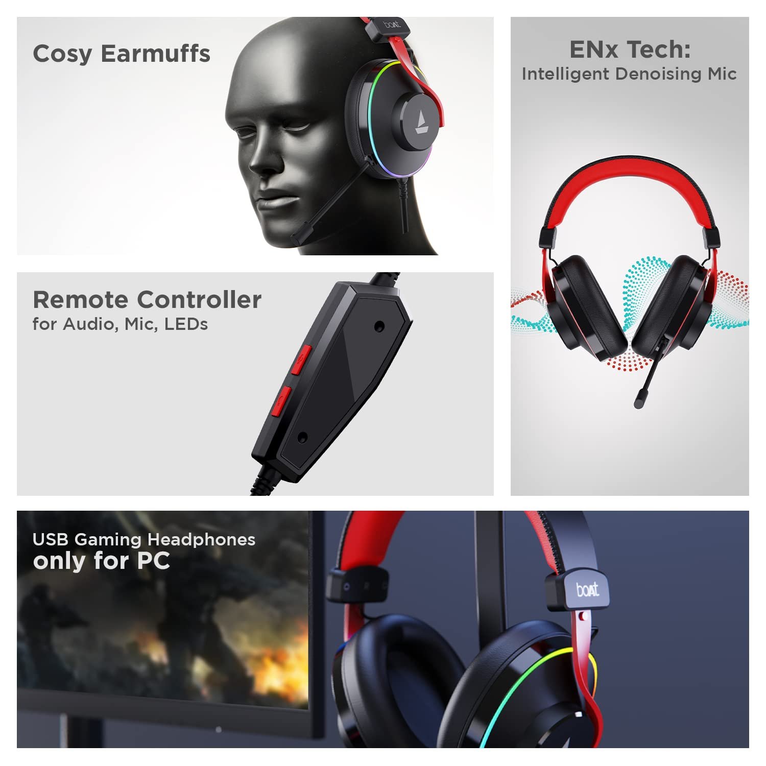 boAt Immortal IM-700 7.1 Channel PC Virtual Surround Sound, ENx Tech, RGB LEDs, Remote Control, Braided Cable USB Wired Over Ear Gaming Headphones with Mic and 50mm Drivers – Black Sabre (Open Box New)