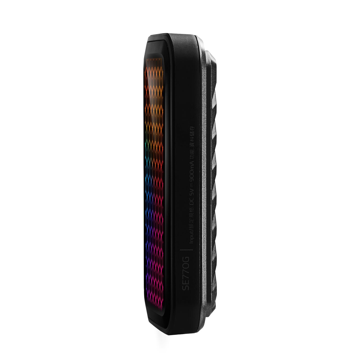 Performance-driven and bold. That sums up the SE770G external solid state drive (SSD). With read/write speeds of 1000/800 MB/s and support for USB3.2 Gen 2 and Type-C, this external SSD is your go-to storage device for video and photo editing and gaming on the move. Performance aside, the SE770G will dazzle too with the unmistakable glow of RGB.