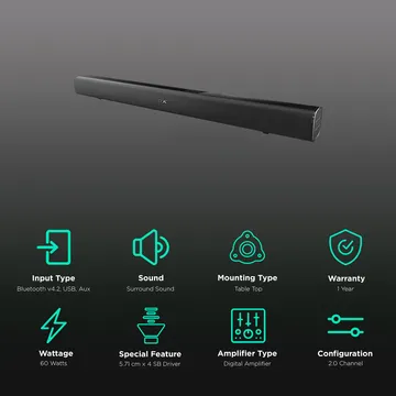 Light up your evenings with the fine-tuned divine essence of the boAt AAVANTE BAR 1150, derived from crystal clear 2.25” x 4 dynamic drivers. Fit for nearly every form of entertainment- switch between the modes to fully utilize the 60W R.M.S and 2.0 Channel Surround Sound output to suit your mood. The premium black colour design with its sleek build can be mounted up on placed anywhere to add to a home’s surroundings. Connect with Wireless Bluetooth V4.2 to any of your preferred devices and set the swing in notion, Nirvana is on the way. Connect to TV’s and other devices with the Aux port and slip into an alternate cinematic experience altogether with the surreal sound of the boAt AAVANTE BAR 1150. Equipped with an easy use control board as well as remote control, guide your audio senses to the realm of Nirvana with the boAt AAVANTE BAR 1150. Bring your home to life.