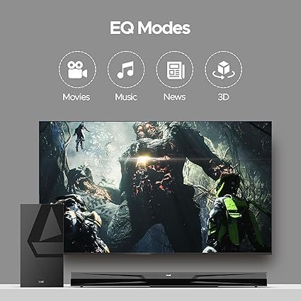 EQ Modes: Dive into tailored audio with this soundbar’s dedicated entertainment EQ modes, like Movies, Music, News, and 3D. Immerse yourself in movies or explore new music albums with powerful sound for company.