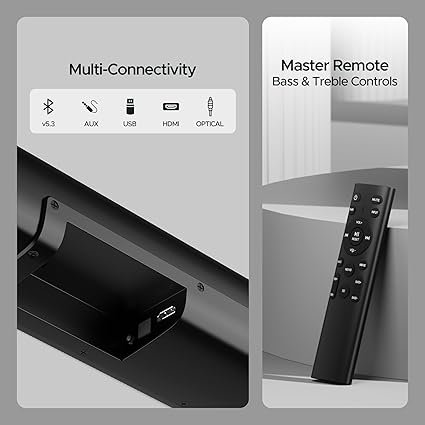 Multichannel Connectivity (BT v5.3, AUX, USB, Optical, HDMI-ARC): Choose from wireless Bluetooth v5.3 or any one of the ports -AUX, USB, HDMI-ARC, optical - to connect your device and relax to your playlist.