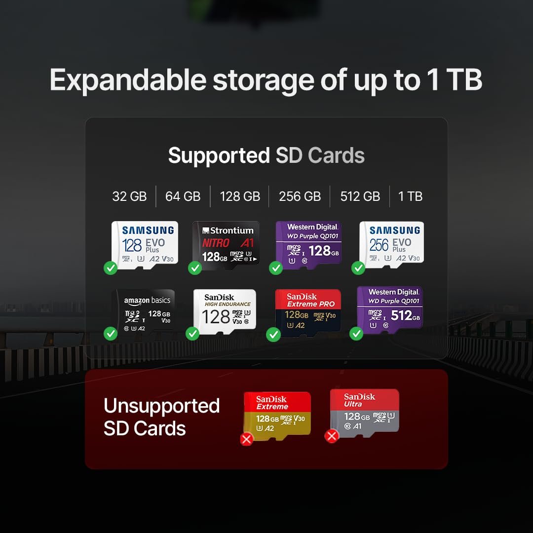 【1TB SD Card Support】Massive expandable storage lets you archive long road trips without compromise (SD card not included).