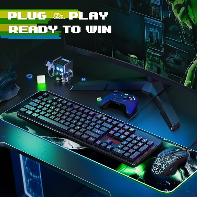 Mechanical Feel Gaming Keyboard; 104 quiet keys designed for longevity, durability and responsiveness. The keyboard features a solid Aircraft-grade Aluminum and ABS construction with double-shot injection molded keycaps