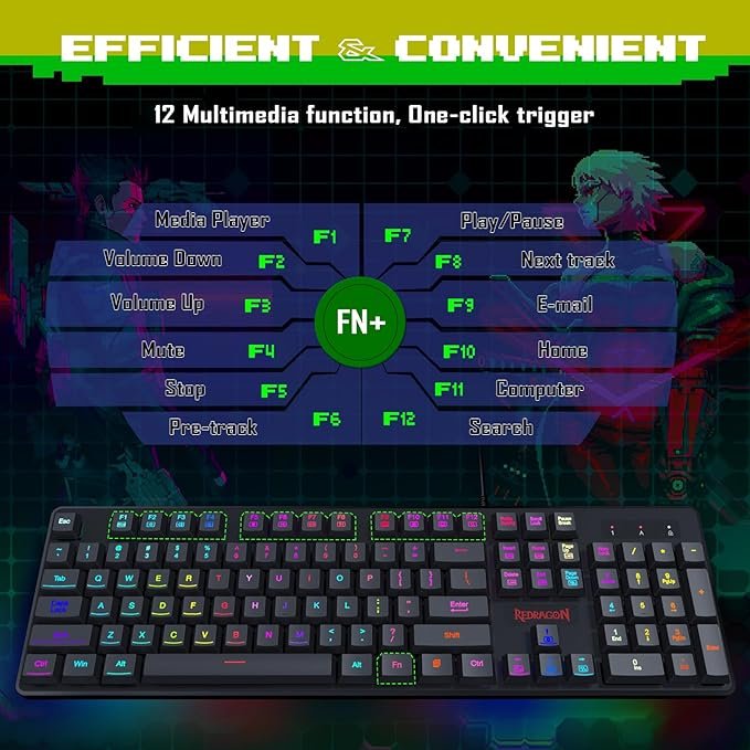 RGB LED Backlit Gaming Keyboard; K509 Redragon RGB LED Keyboard has 7 different colors (Blue, Green, Red, Cyan, Yellow, Purple, White, OFF). 4 backlight brightness levels and adjustable breathing speed